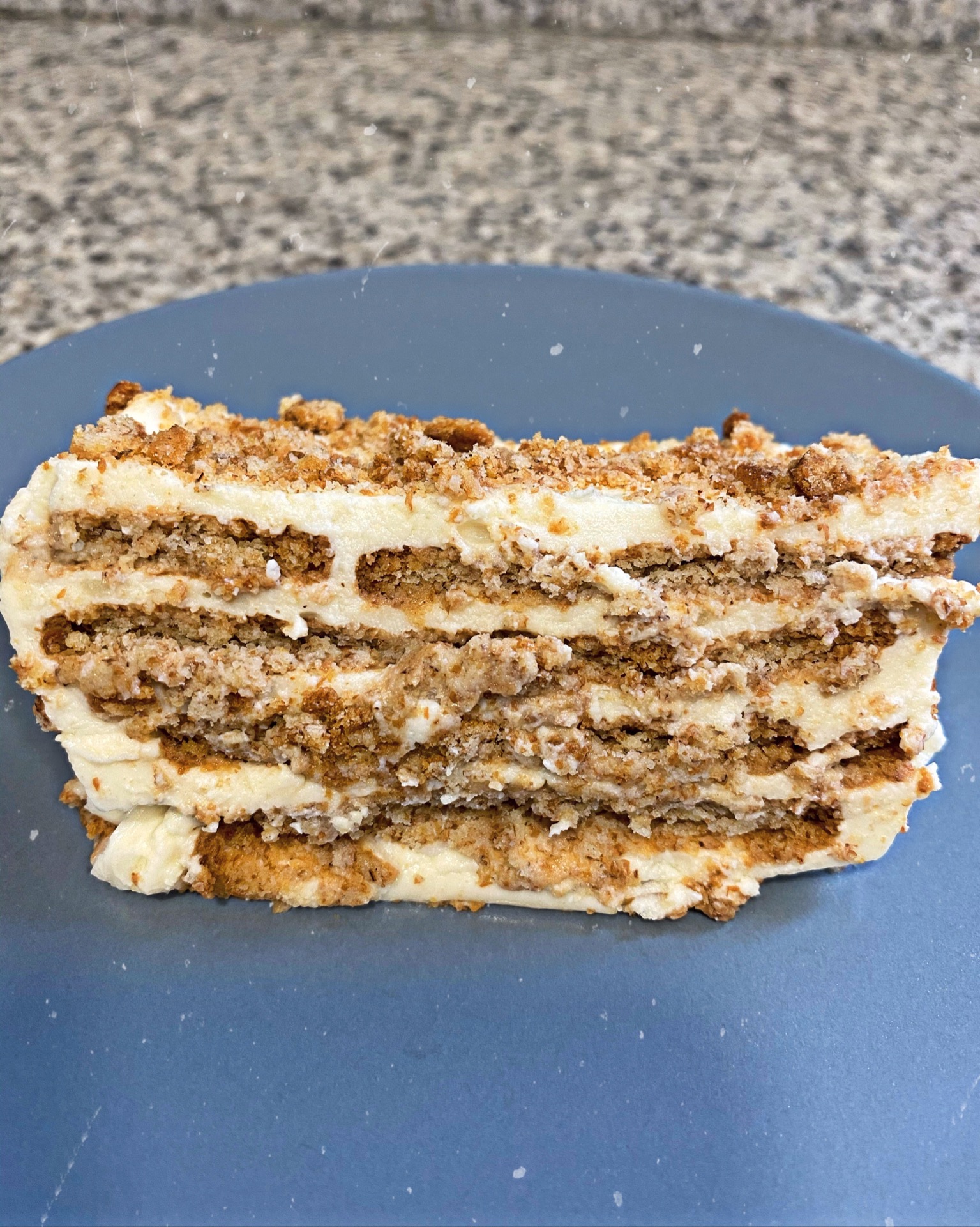 Poner la 1/2 taza de bebida vegetal en un plato con un poco de edulcorante para mojar las galletas. Agregar primero una capa de mezcla de limón, luego una de galletas pasada primero por la bebida vegetal para humedecerlas un poco, y así hacer capas intercaladas hasta acabar la mezcla.